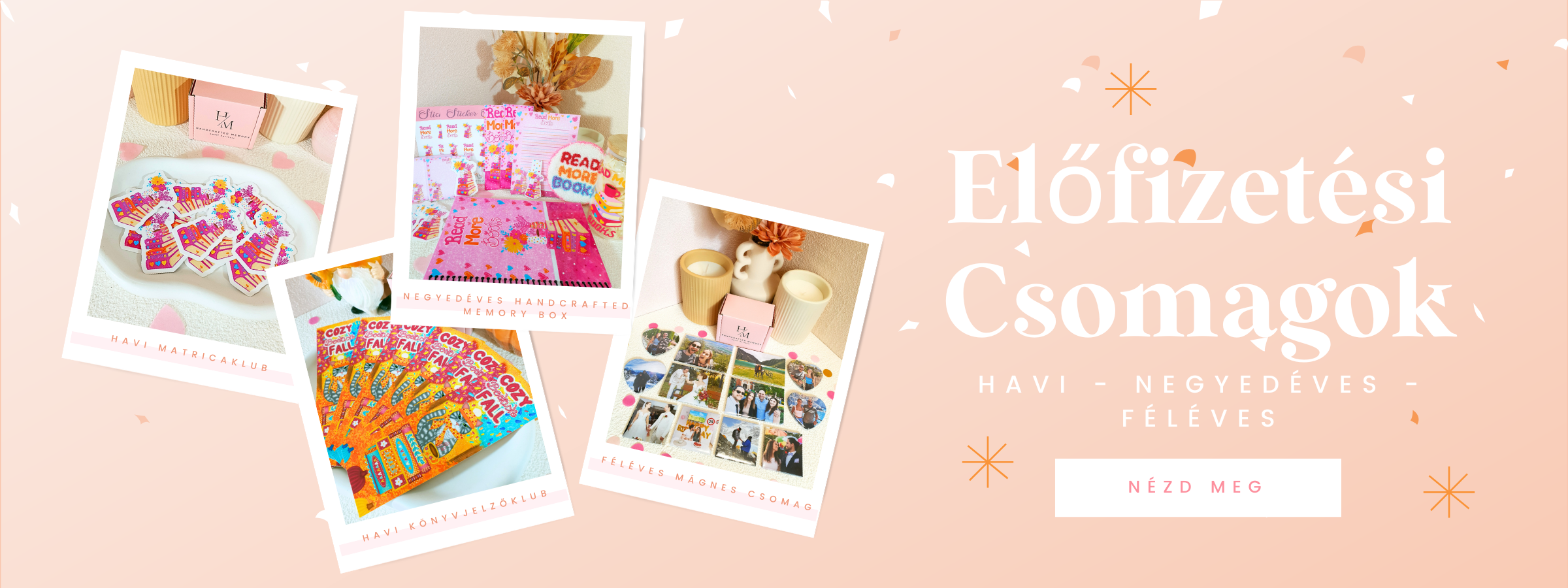 Képzeld el, hogy kinyitod a postaládádat, és egy örömteli kis csomag vár rád – tele meghitt apróságokkal. Előfizetéses csomagjainkat szeretettel állítjuk össze, saját illusztrációinkkal díszített termékekkel, hogy mosolyt csaljanak az arcodra és színt vigyenek a mindennapjaidba – akár havonta, negyedévente vagy évente kétszer. Minden doboz egyedi témát követ, gondosan válogatott tartalommal.