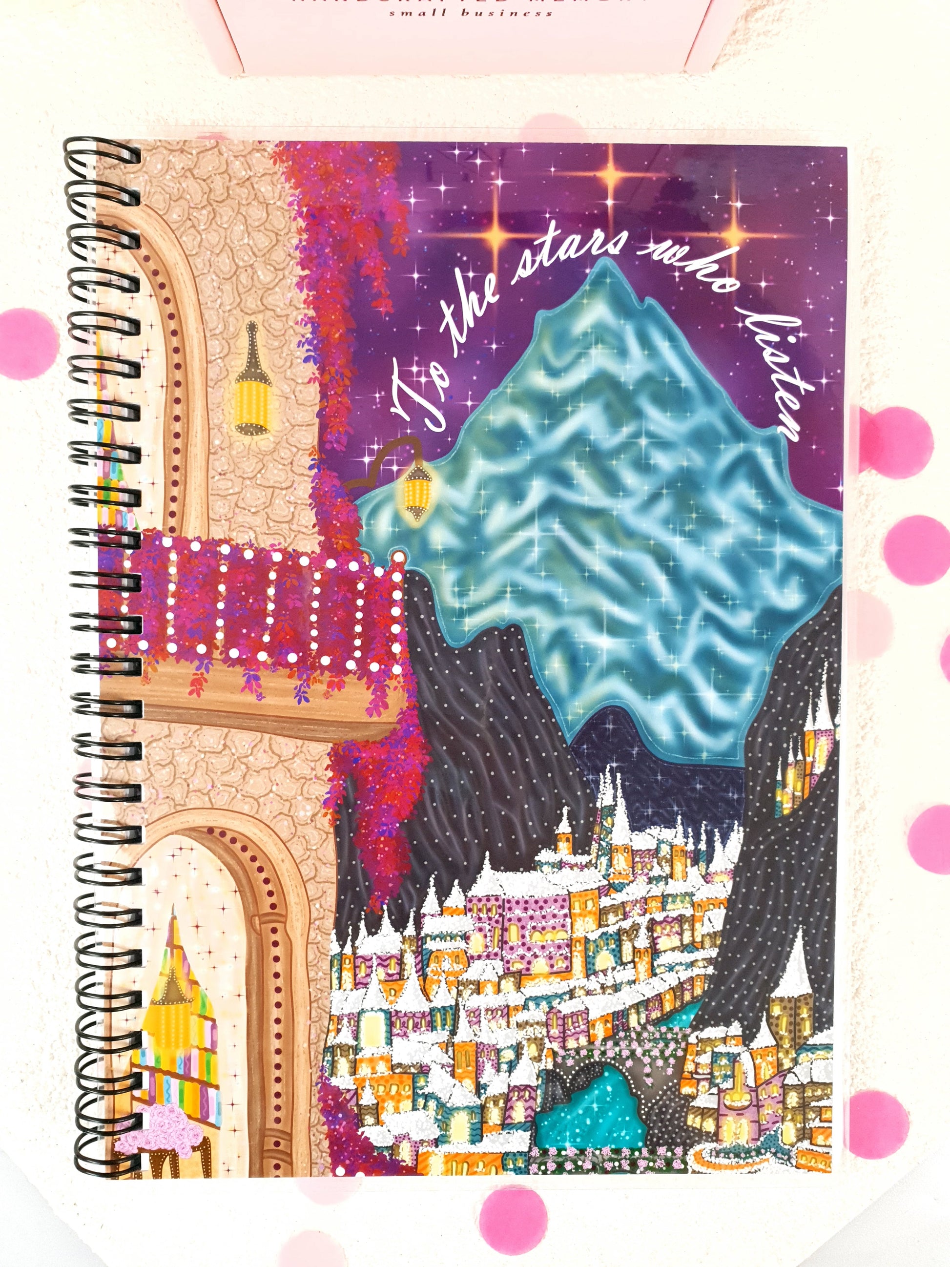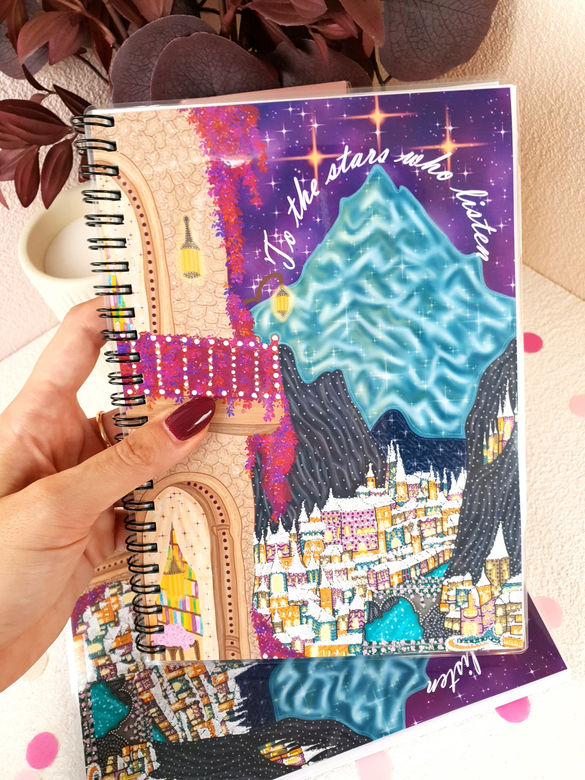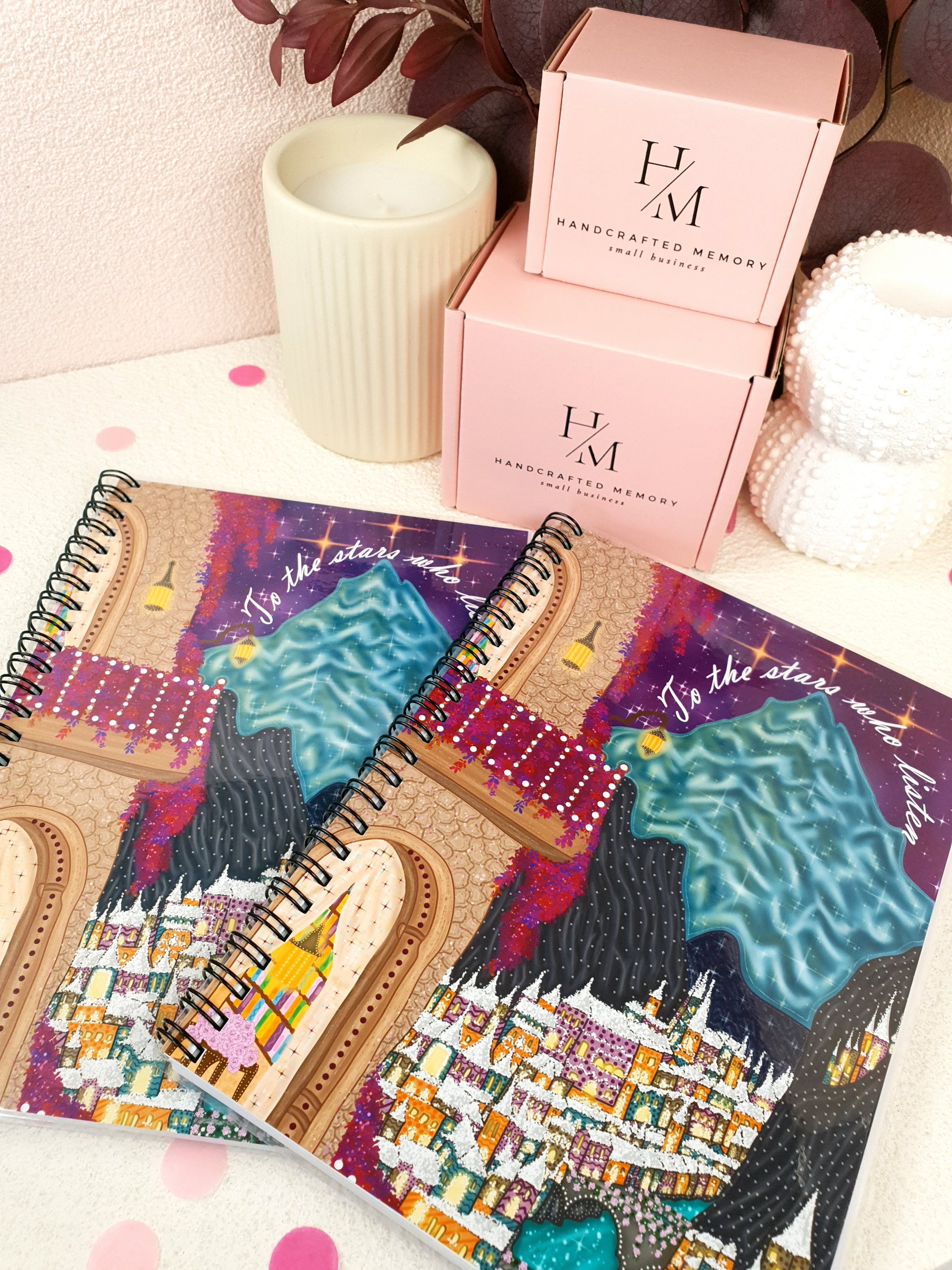 Lépj be a Csillagfény Városába ezzel az álomszép, illusztrált A5 spirálfüzettel, amelyet Velaris varázslatos világa ihletett. Kanyargó utcák, csillogó víztükrök és havas tetők kelnek életre alkonyi kékek, lágy rózsaszínek és égi lila árnyalataiban—minden részlet kézzel rajzolt, hogy csodát és kalandvágyat ébresszen.