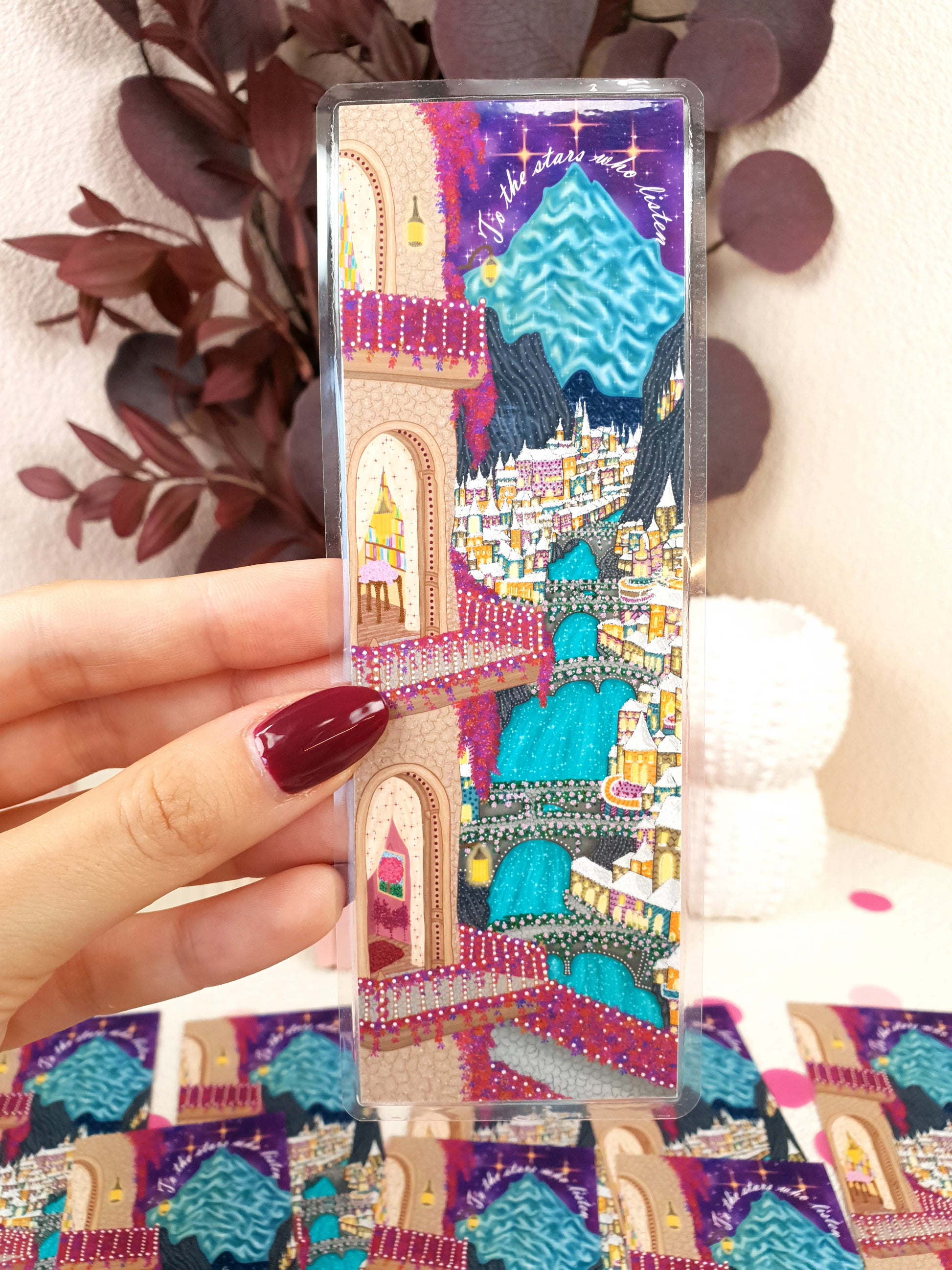Lépj be a Csillagfény Városába ezzel az álomszép, illusztrált könyvjelzővel, amelyet Velaris varázslatos világa ihletett. Kanyargó utcák, csillogó víztükrök és havas tetők kelnek életre alkonyi kékek, lágy rózsaszínek és égi lila árnyalataiban—minden részlet kézzel rajzolt, hogy csodát és kalandvágyat ébresszen.