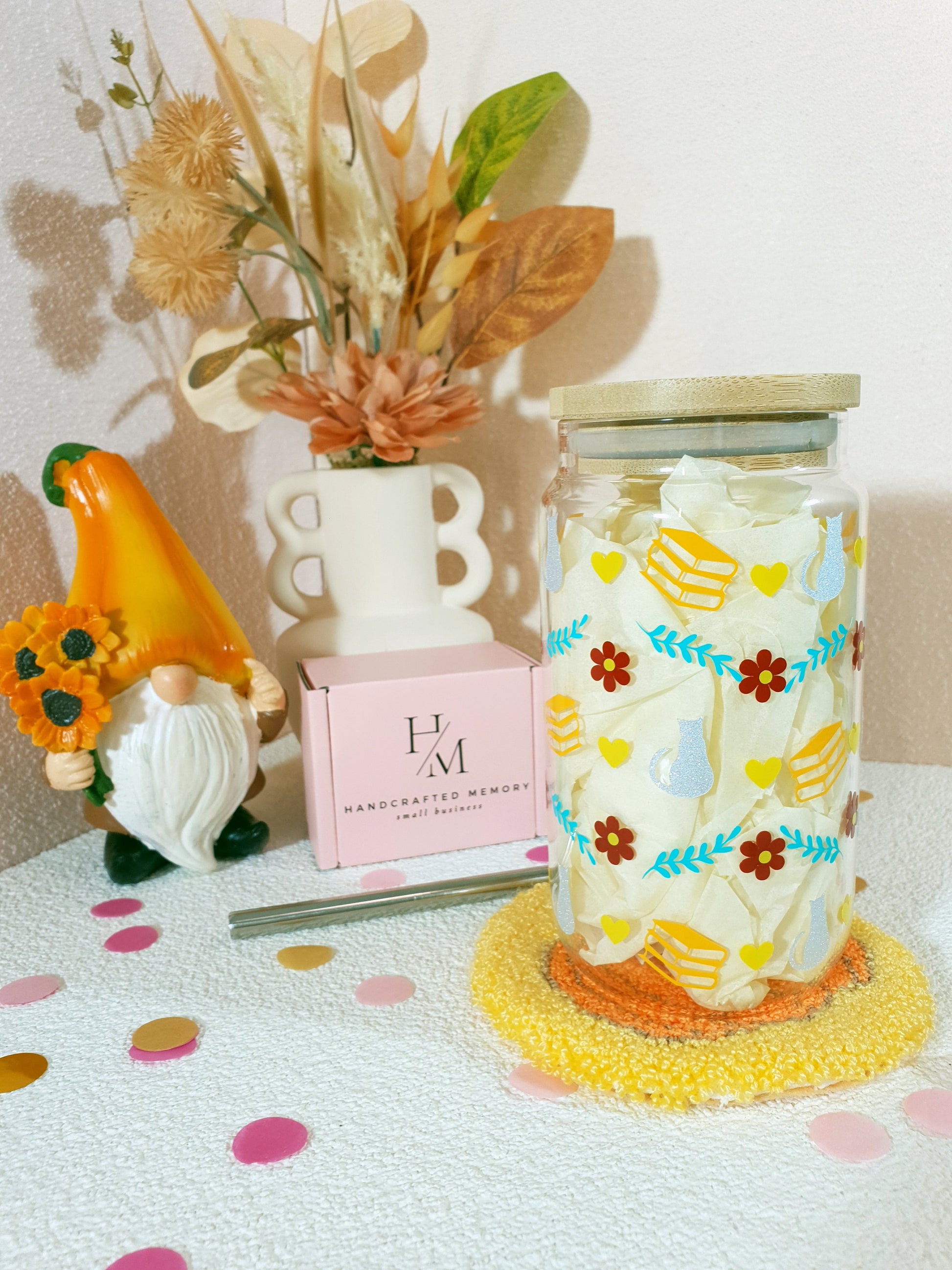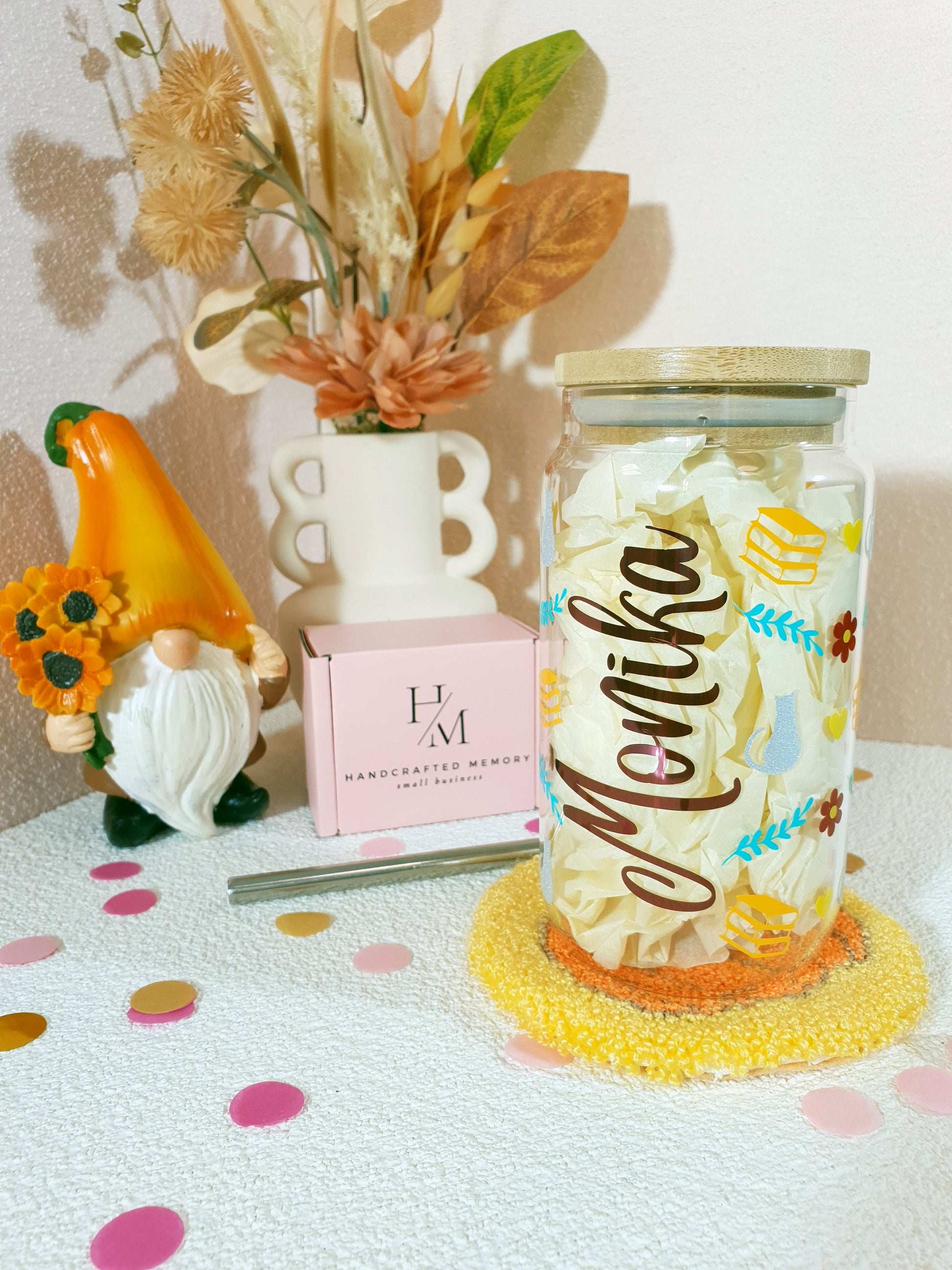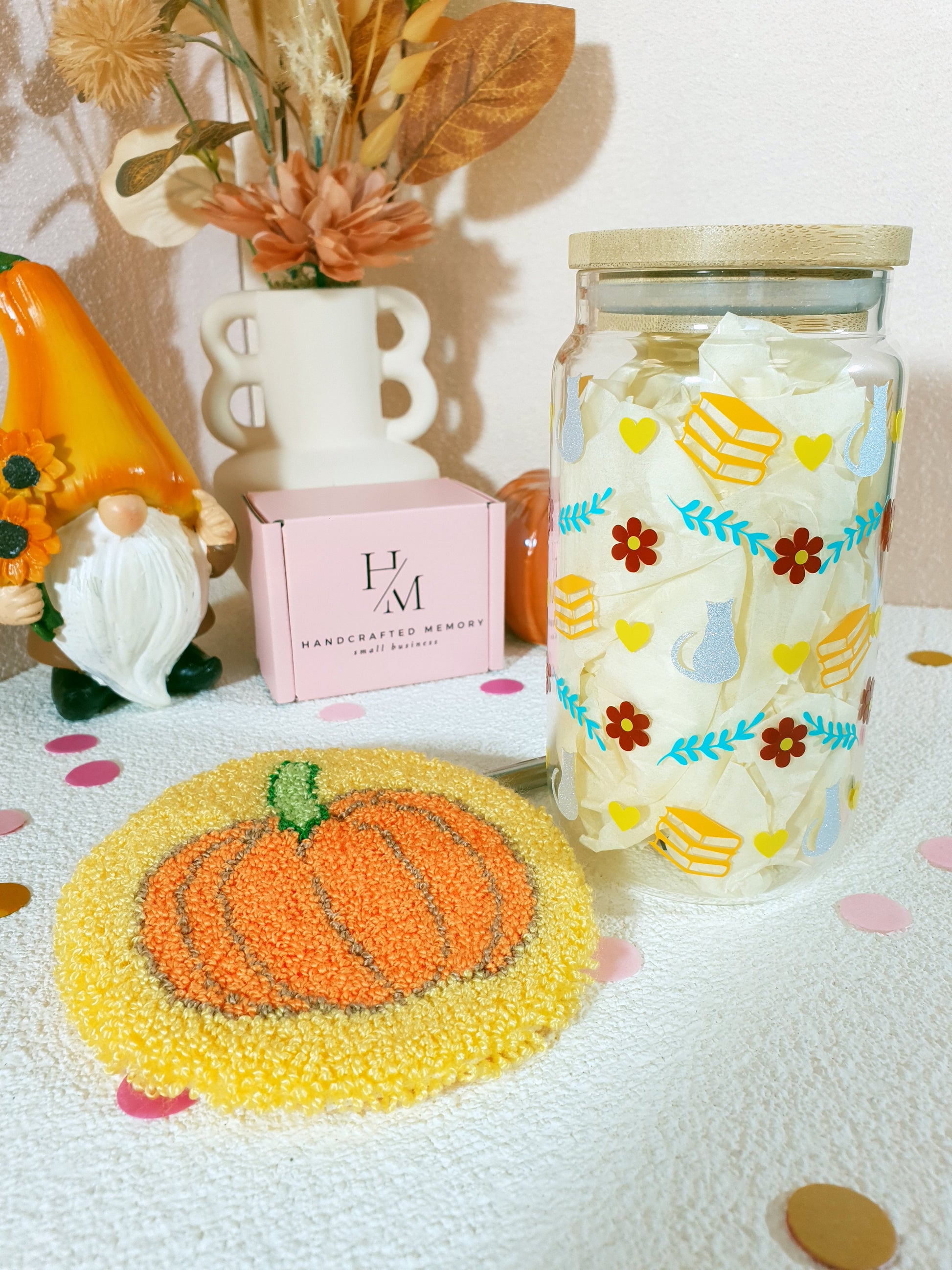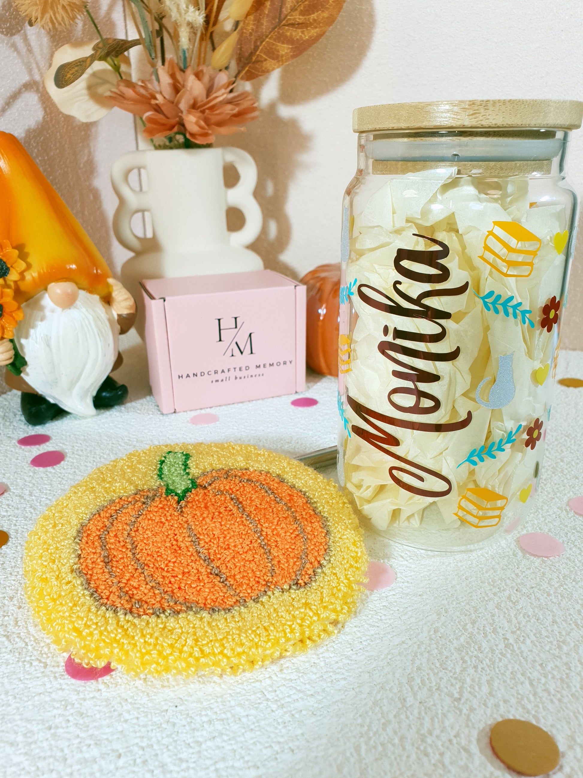 Kortyolj stílusosan ebben az évszakban! Az Őszi Kuckó csomag egy vidám és játékos párosítás, amely egy színes, cicás üveg / műanyag poharat és egy kézzel készült sütőtökös Mug Rug alátétet tartalmaz – tökéletes kiegészítője a reggeli rituáléidnak, olvasós perceidnek vagy kuckós teázásaidnak.
