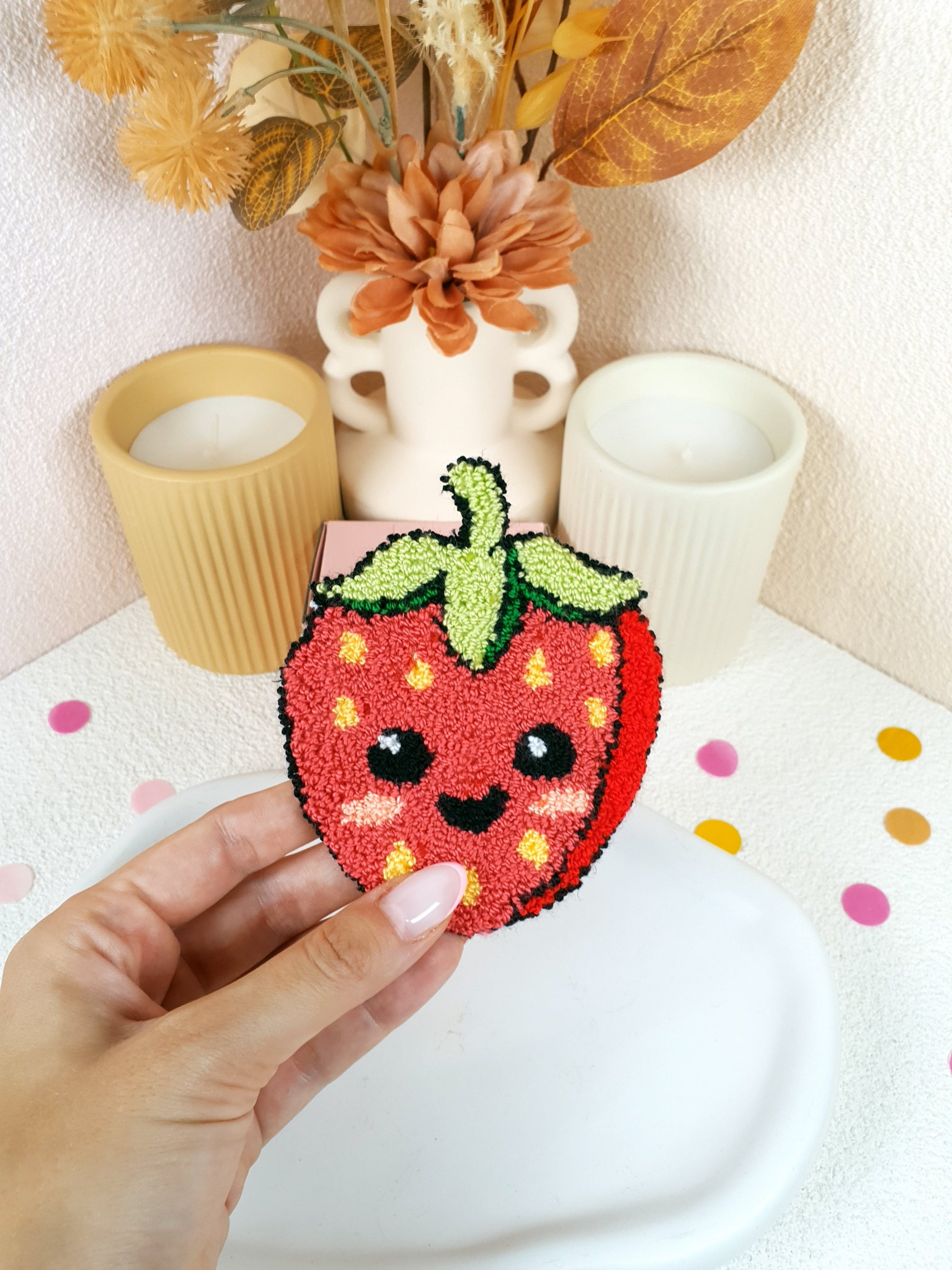 Add a splash of whimsy to your coffee break with this adorable Strawberry Mug Rug. Handcrafted with love and bursting with personality, this tufted textile piece features a cheerful strawberry design complete with a smiling face, vibrant red body, green leafy top, and sunny yellow seeds. Its playful expression and cozy texture make it a delightful companion for your favorite mug.