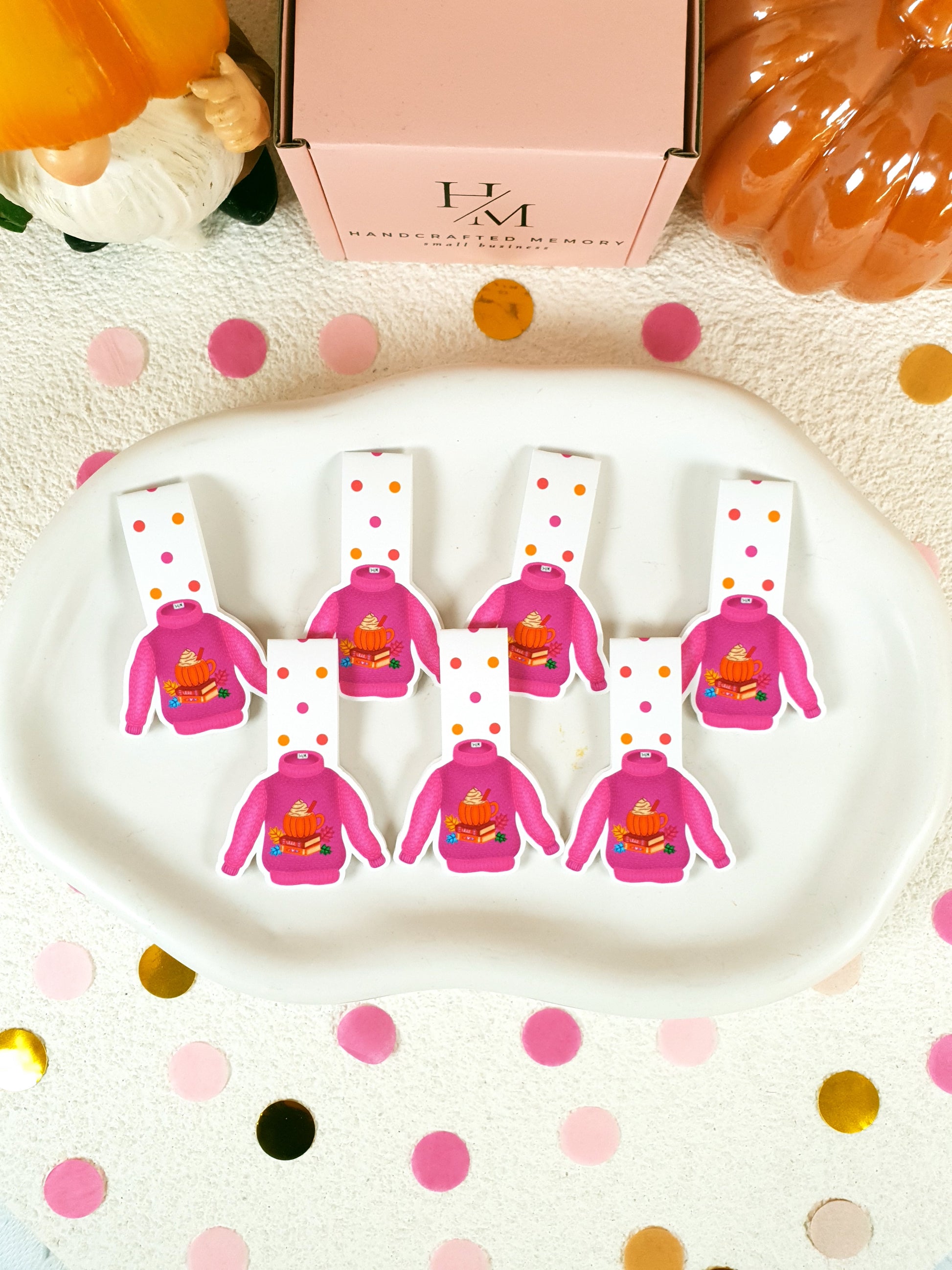Add a sprinkle of seasonal cheer to your reading routine! This playful magnetic bookmark features a pinkish-purple sweater and a festive autumn illustration—think pumpkins, swirling leaves, and cozy vibes. It clips gently yet securely to your pages, making it a charming companion for books, planners, or journals. A joyful little reminder to celebrate the small moments, handmade with love to brighten every chapter.