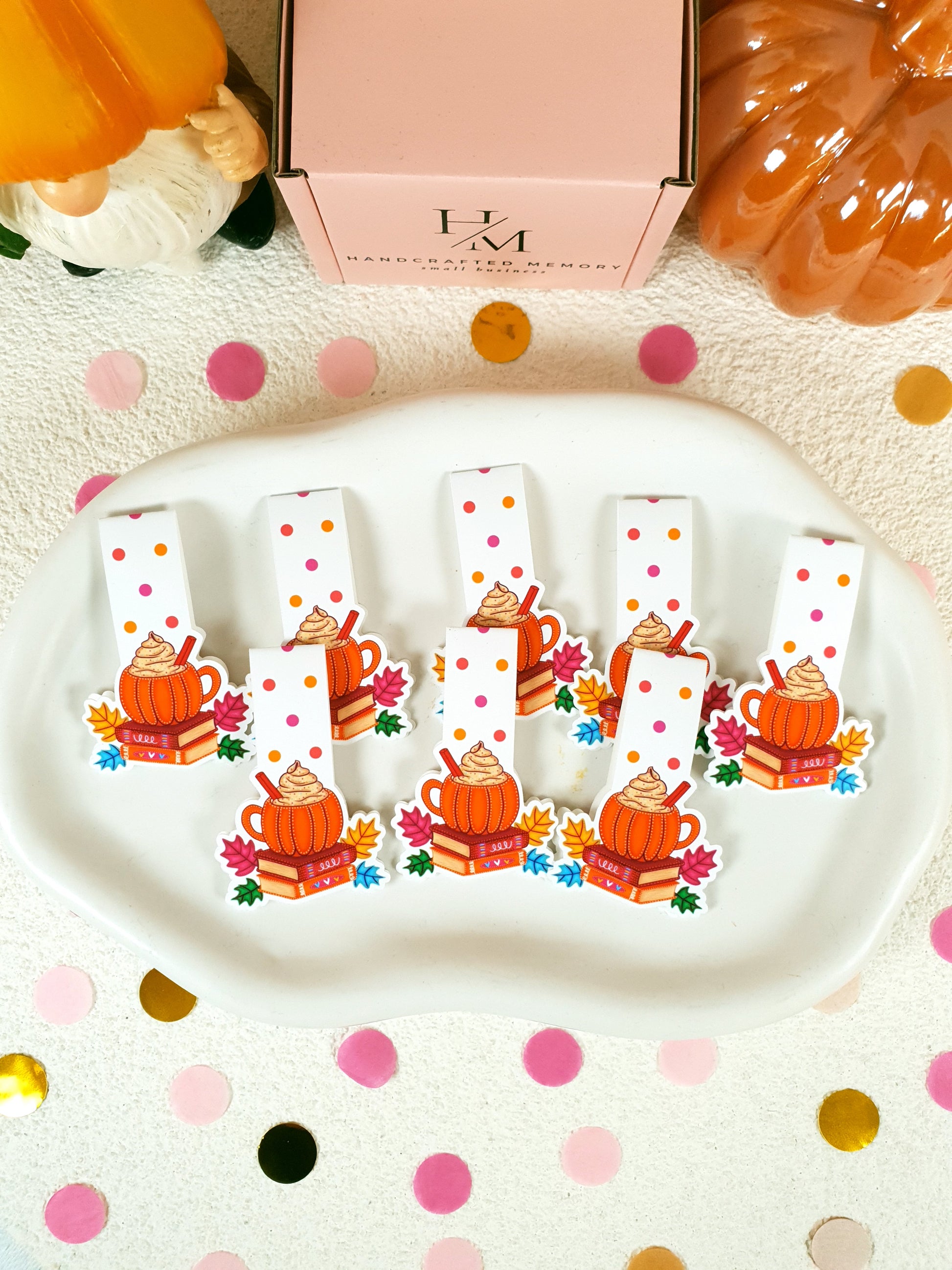 Celebrate the season of stories with this adorable magnetic bookmark! Featuring a pumpkin-shaped mug topped with whipped cream, stacked books labeled and a swirl of autumn leaves and polka dots, it’s the perfect companion for your favorite reads.