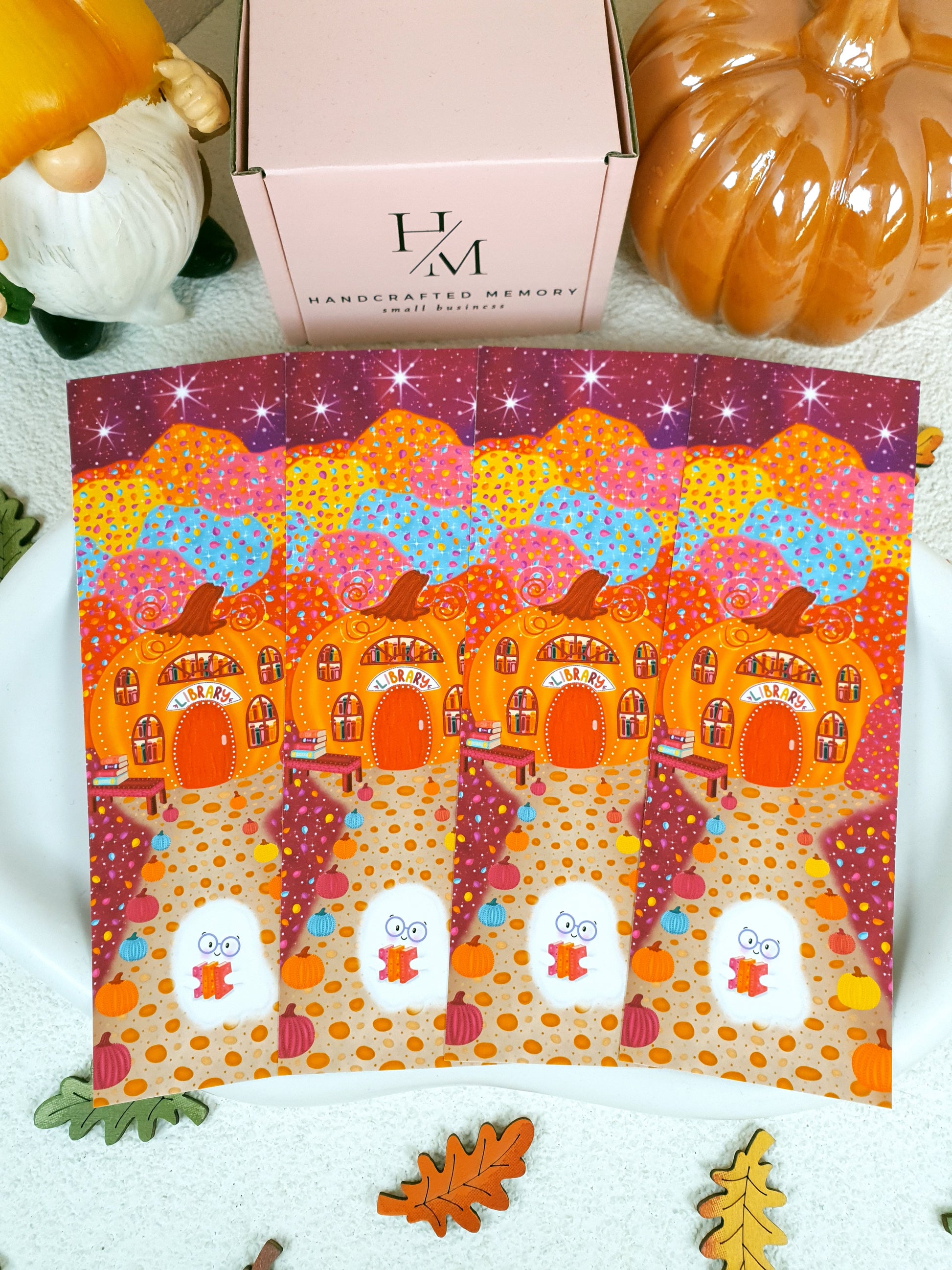 Celebrate Fall with this cozy trio of hand-illustrated bookmarks! Featuring whimsical pumpkin library, stacks of books, and our sweet ghost friend Boodolf, each design brings a touch of autumn magic to your reading moments. Printed on premium matte cardstock — perfect for book lovers and collectors alike.