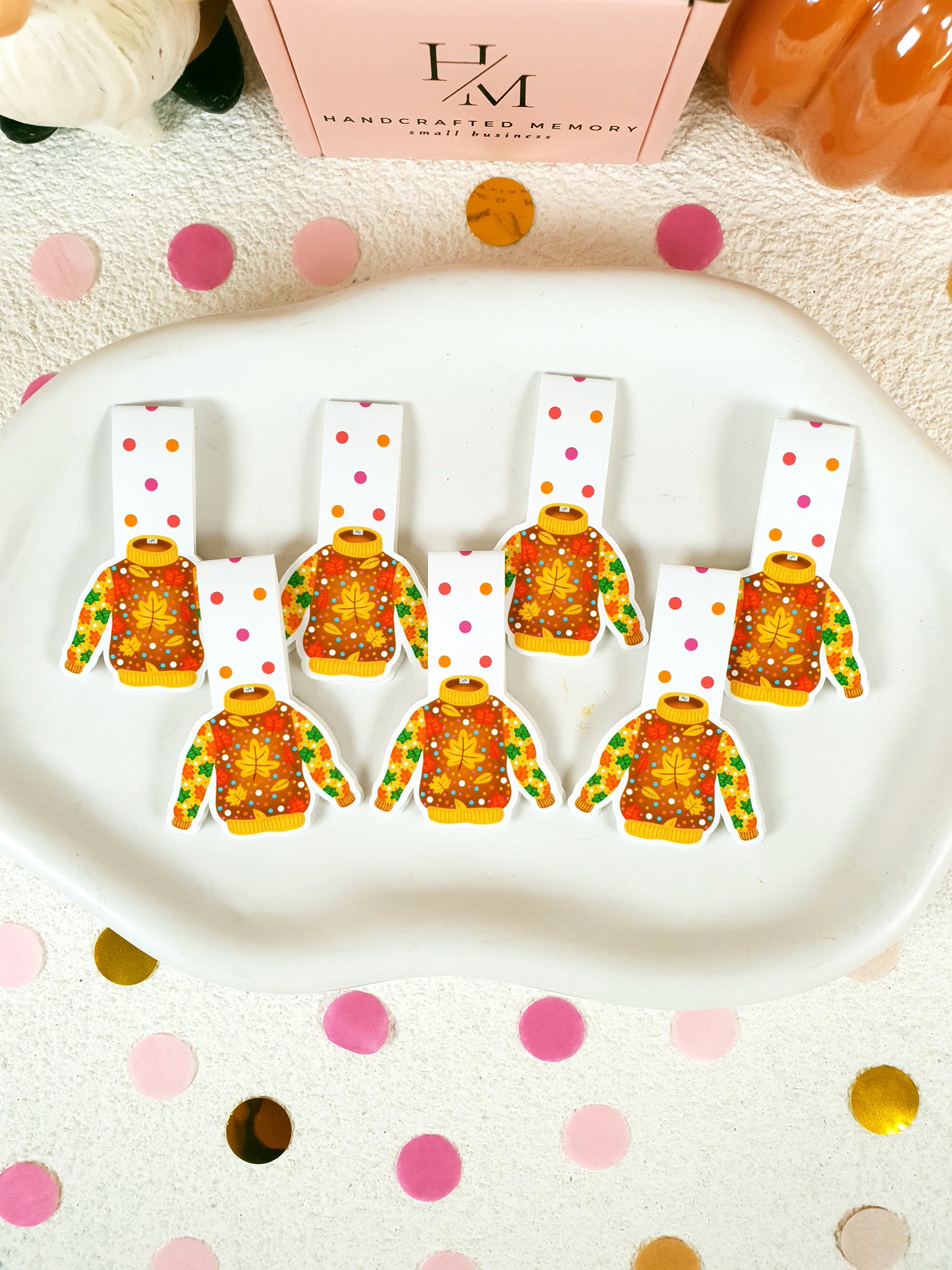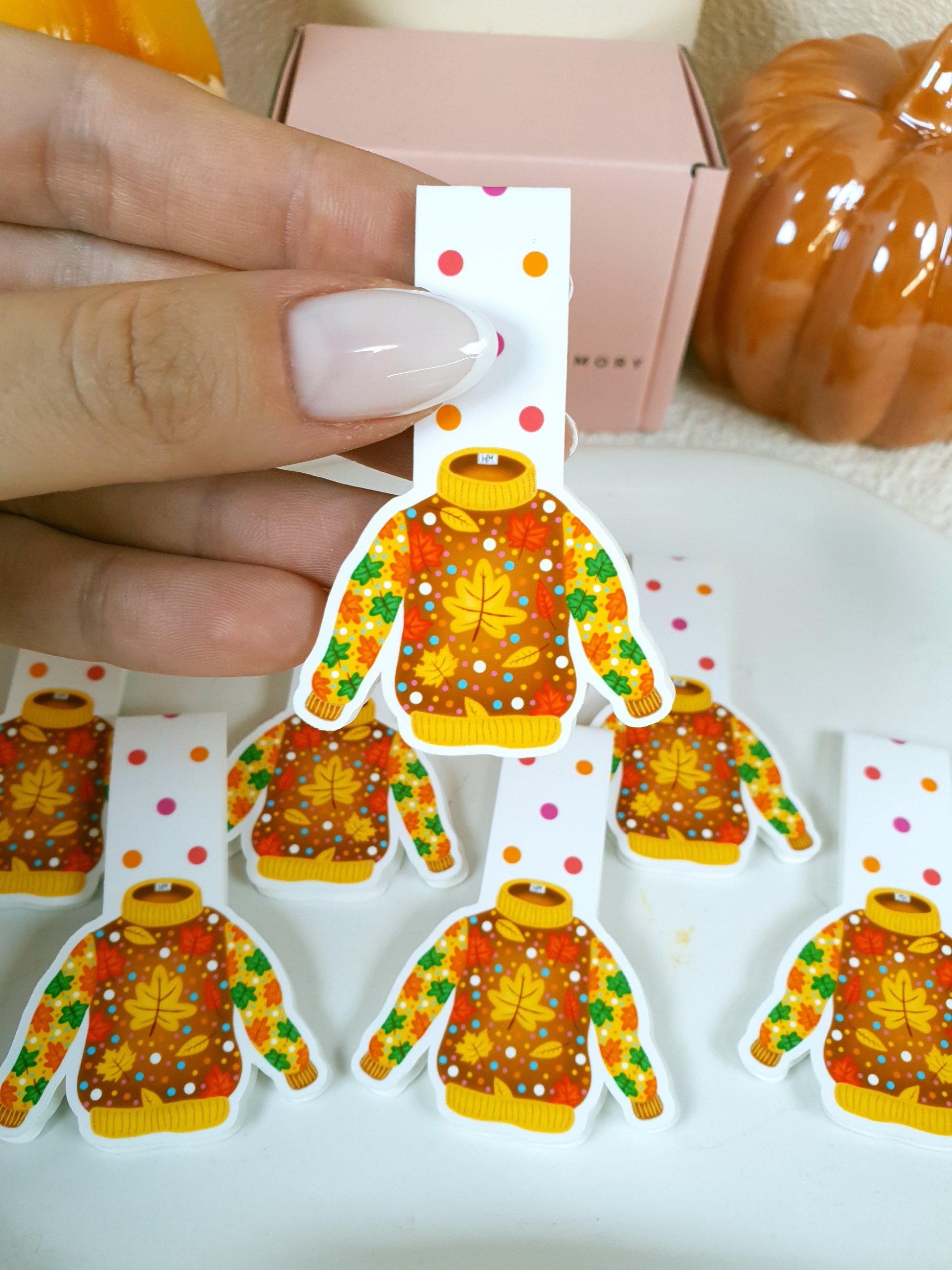 Celebrate the golden glow of fall with this charming magnetic bookmark! Dressed in a yellowish-brown sweater adorned with colorful autumn leaves, it brings a touch of seasonal magic to your books, planners, or journals. Handmade with love to brighten your pages and your day.
